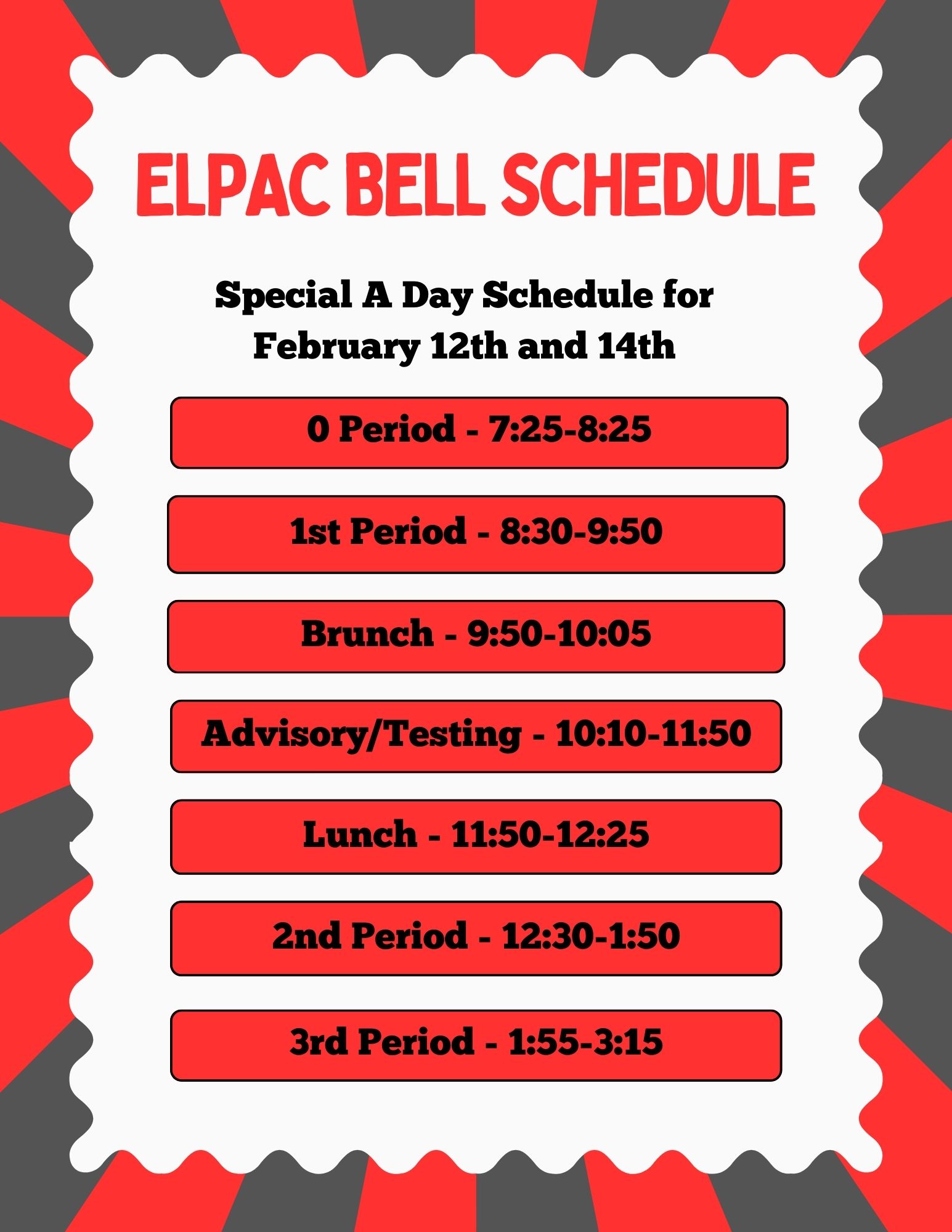 The ELPAC will be administered during the advisory period on Wednesday, February 12 and Friday, February 14. Students who are taking the ELPAC exam need to bring their fully charged Chromebook to school on testing days.