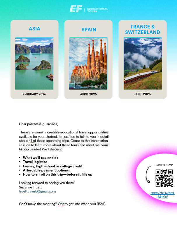 It's a new school year and a new opportunity to explore the world with your friends! (Adults are welcome, too!  ) Come to TRAVEL NIGHT on September 18th at 7:00pm in room AD300 to learn more about our exciting 2026 trips.